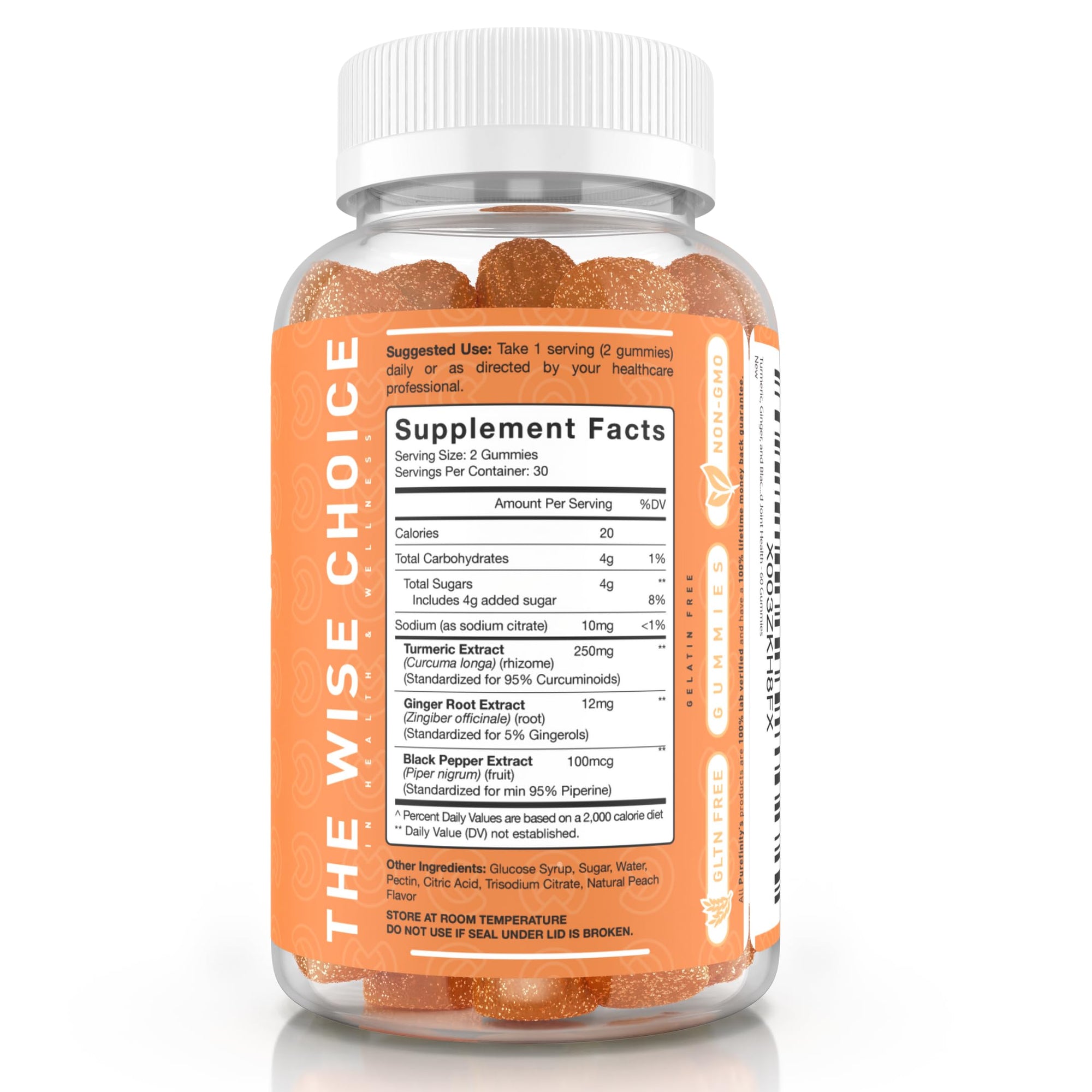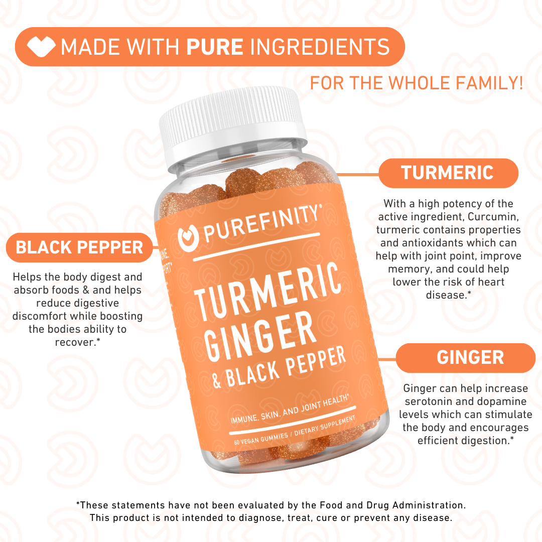 - 60 Peach Flavored Turmeric Ginger Gummies – Revitalize your body with PUREFINITY Turmeric, Ginger & Black Pepper Gummies with natural peach flavor.*